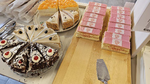Torten und andere feine Sachen. Würstli und Salat zum Mittag oder Abendessen.