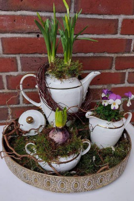 Aus den ausgewählten Tassen, Schalen und Tellern Frühlingsarrangements.