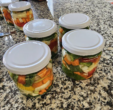 Alle Teilnehmenden nehmen das selbst verarbeitete Gemüse mit nach Hause. Bei einem einfachen Mittagsbuffet können verschiedene fermentierte Gemüse degustiert werden.
